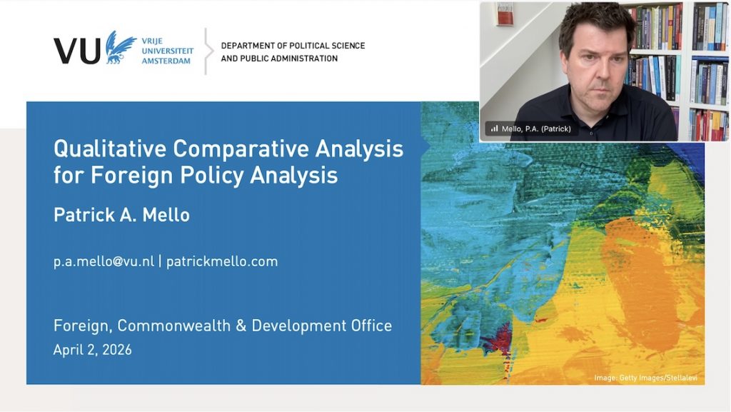 On April 2, I was invited to give an online methods masterclass for the members of the Evaluation and Statistics cadres of the Foreign, Commonwealth & Development Office of the United Kingdom, speaking about “Qualitative Comparative Analysis (QCA) for Foreign Policy Analysis”. The talk comprised a concise introduction to the method and approach of QCA, based on my 2021 book with Georgetown University Press. For the second part, the FCDO members asked me to speak about my applied QCA study on the Unintended Consequences of UN Sanctions, an open-access article that was co-authored with Katharina Meissner (replication data for this article is available here: https://doi.org/10.7910/DVN/9BGOYQ). Many thanks to Harry Achillini for the invitation and organization–and to all participants for the intriguing questions during the Q&A!